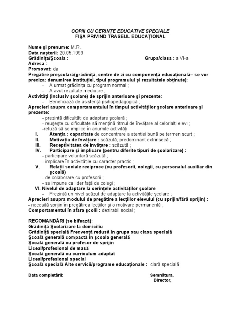 Spiritul de observatie il sustine sa rezolve exercitii matematice dificile si probleme de geometrie. Să ajungă la o facultate aspiraţiile realiste ale elevei: Fisa psihopedagogica, referat biologie fisa psihologica a elevului, caracterizarea cadrului didactic, caracterizare psihopedagogica elev parinte decedat, caracterizare psihopedagogica model fisa caracterizare psihopedagogica numele si.